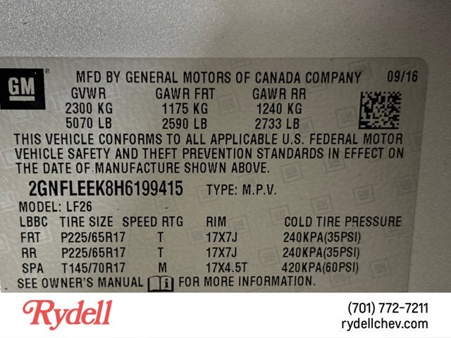 - Tires, P225/65R17 all-season, blackwall (Included and only available with (RSB) 17" (43.2 cm) aluminum wheels or (RVF) 17" (43.2 cm) aluminum wheels.)